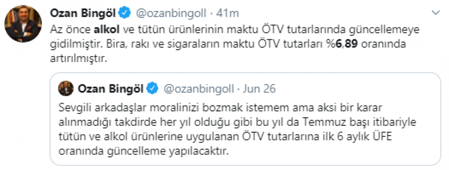Vergi uzmanı ve ekonomist Ozan Bingöl, resmi Twitter hesabından son dakika paylaşımı yaparak alkol ve tütünde ÖTV tutarının yüzde 6.89 oranında zamlandığını duyurdu.