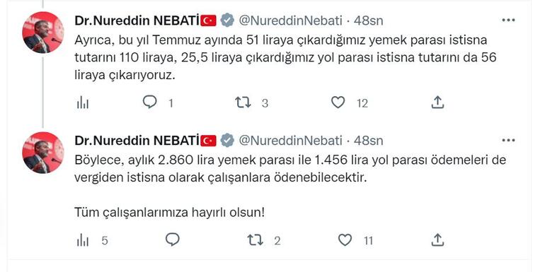 Bakan Nebati, "Bu yıl Temmuz ayında 51 liraya çıkardığımız yemek parası istisna tutarını 110 liraya, 25,5 liraya çıkardığımız yol parası istisna tutarını da 56 liraya çıkarıyoruz. Böylece, aylık 2.860 lira yemek parası ile 1.456 lira yol parası ödemeleri de vergiden istisna olarak çalışanlara ödenebilecektir.”