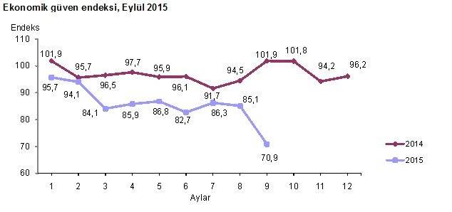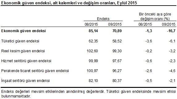 Ekonomik güven endeksi Eylül ayında bir önceki aya göre yüzde 16.7 azalarak 70.89 değerine gerilerken, TÜİK'in veriyi hesaplamaya başladığı Ocak 2012'den beri en düşük değeri aldı.