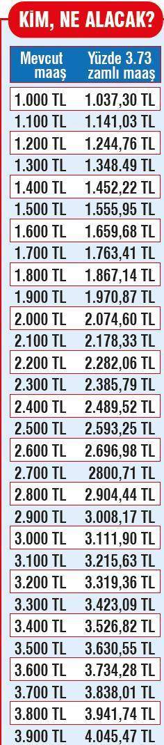 TAKVİM, bu tahmine göre emeklilerin Ocak maaşını kuruşu kuruşuna hesapladı. En düşük maaş, 2000'den önce SSK'dan emekli olanlarda bin 339 lira 18 kuruştan bin 389 lira 13 kuruşa, 2000'den sonra emekli olan SSK'lılarda 798 lira 24 kuruştan 828 lira 1 kuruşa, Bağ- Kur esnaf emeklilerinde bin 163 lira 38 kuruştan bin 206 lira 77 kuruşa, Bağ-Kur tarım emeklilerinde ise 916 lira 55 kuruştan 950 lira 73 kuruşa çıkacak. Halen bin 500 lira maaş alan bir emeklinin eline, zammın yüzde 3.73 lira olması durumunda bin 555 lira 95 kuruş geçecek. Merkez Bankası'nın tahmini tutarsa, memur emeklileri Ocak'ta enflasyon farkı alamayacak. Çünkü memur emeklilerine Ocak'ta fark verilebilmesi için 2016'nın ikinci yarısındaki enflasyonun yüzde 5'i aşması gerekiyor. Bu durumda memur emeklilerinin Ocak ayı artışı, toplu sözleşmede yer alan yüzde 3'lük zam olacak.