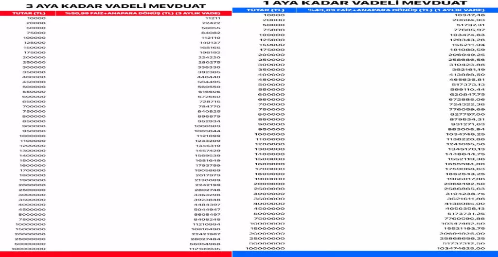 Mevduat faiz oranlarındaki bu dalgalanma, yatırımcıların bir yıl süreyle mevduat tuttuklarında elde edecekleri getiriler üzerinde de etkili oldu. Özellikle, aylık vade ile yatırım yapıldığında ve faiz oranları bu seviyede sabit kaldığında, anapara ve faiz yenilemeleriyle birlikte yüzde 53,90 oranında getiri sağlanabiliyor. Üç aylık vadede ise yüzde 50,99 faiz oranıyla yapılan yatırımlar, yıl sonunda %61,59 oranında bir getiriye ulaşıyor.