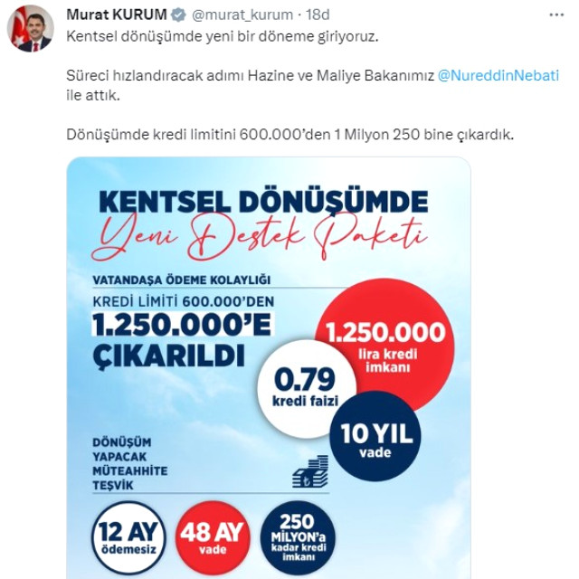 Çevre, Şehircilik ve İklim Değişikliği Bakanı Murat Kurum da sosyal medya paylaşımında, "Kentsel dönüşümde yeni bir döneme giriyoruz. Süreci hızlandıracak adımı Hazine ve Maliye Bakanımız @NureddinNebati ile attık. Dönüşümde kredi limitini 600.000'den 1 Milyon 250 bine çıkardık." dedi.