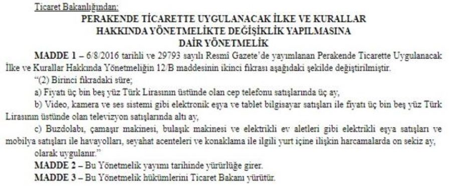 Ticaret Bakanlığı milyonlarca kişiyi ilgilendirecek karar aldı. Resmi Gazete'de yayımlanan karara göre, Perakende Ticarette Uygulanacak İlke ve Kurallar Hakkındaki yönetmelikte yapılan değişiklikle havayolları, seyahat acenteleri ve konaklama ile ilgili yurt içine ilişkin harcamalarda on sekiz ay kredi kartına taksit uygulaması yapılabilecek.