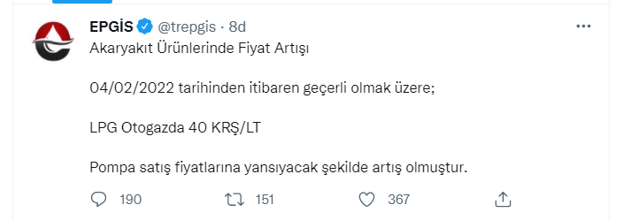 Enerji Petrol Gaz İkmal İstasyonları İşveren Sendikası'nın (EPGİS) yaptığı duyuruya göre, bu gece yarısından itibaren geçerli olmak üzere otogazın litre satış fiyatına 40 kuruş zam yapıldı. Fiyat artışının ardından otogazın litre satış fiyatı İstanbul'da ortalama 9,38 liradan 9,78 liraya, Ankara'da 9,49 liradan 9,89 liraya, İzmir'de ise 9,43 liradan 9,83 liraya yükselecek.