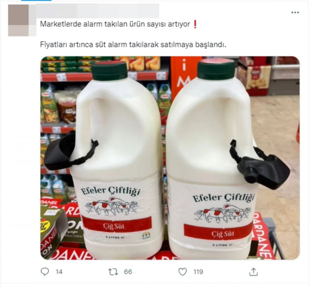 Bir Twitter kullanıcısı yaptığı paylaşımla süte de alarm takılarak satılmaya başlandığını duyurdu.