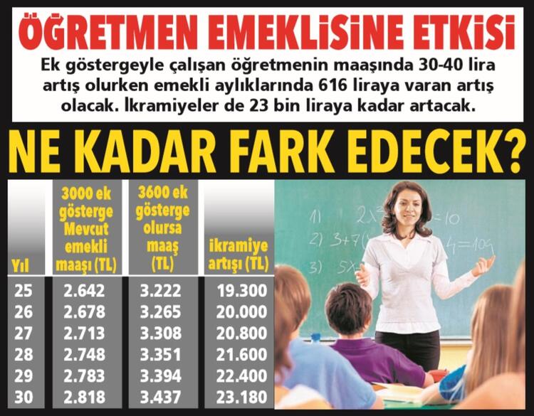 Ek göstergenin 2200’den 3600’e çıkmasıyla 25 yıl hizmeti bulunan öğretmen, polis, hemşire, din görevlisi ve idarecilerin emekli aylıkları 653.15 lira, 30 yıl hizmeti bulunanların 696.69 lira, 35 yıl hizmeti bulunanların da 740.24 lira artacak.