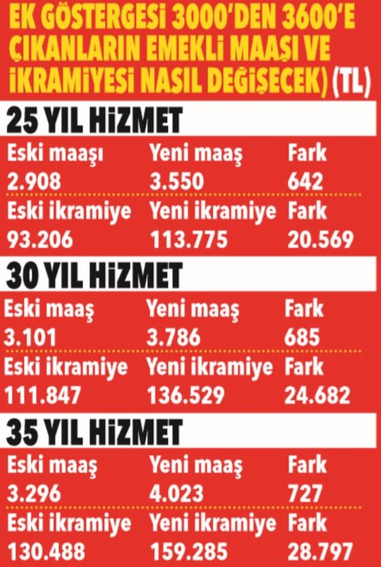 Ek göstergenin 2200’den 3600’e çıkmasıyla 25 yıl hizmeti bulunanların emekli ikramiyesi 82 bin 345 liradan 103 bin 279 liraya yükselecek.