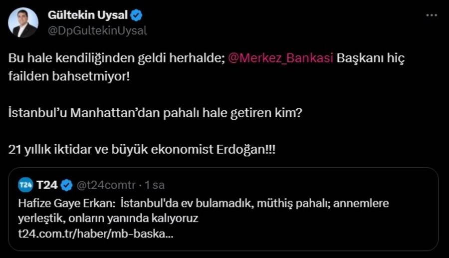 Demokrat Parti Genel Başkanı Gültekin Uysal, Twitter hesabından yaptığı açıklamada Erkan'ın sözlerine eleştirel bir yaklaşım sergileyerek, "Bu hale kendiliğinden geldi herhalde; @Merkez_Bankasi Başkanı hiç failden bahsetmiyor! İstanbul’u Manhattan’dan pahalı hale getiren kim? 21 senelik iktidar ve büyük ekonomist Erdoğan!!!" ifadelerini kullandı.