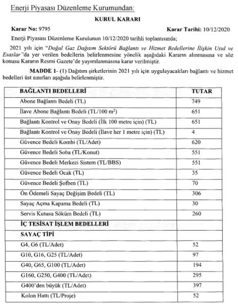 Enerji Piyasası Düzenleme Kurulu (EPDK), 2021 yılı için doğal gaz dağıtım sektörü bağlantı ve hizmet bedellerini belirledi. EPDK'nın konu ile ilgili kararı Resmi Gazete'de yayımlandı. Fiyatlar 1 Ocak 2021'den itibaren geçerli olacak.