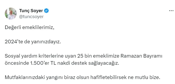 Bu olumsuz tablonun bir nebze olsun hafifletilmesi adına, İzmir Büyükşehir Belediyesi, kent genelinde bulunan 25 bin emekliye 1500 TL'lik bayram ikramiyesi yatıracağını duyurdu. İzmir Belediye Başkanı Tunç Soyer'in sosyal medya hesabından yapılan açıklamada, "Değerli emeklilerimiz, 2024’te de yanınızdayız. Sosyal yardım kriterlerine uyan 25 bin emeklimize Ramazan Bayramı öncesinde 1.500’er TL nakdi destek sağlayacağız. Mutfaklarınızdaki yangını biraz olsun hafifletebilirsek ne mutlu bize." ifadelerine yer verildi.Ekonomi