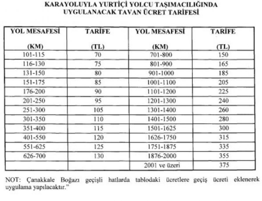 Ulaştırma ve Altyapı Bakanlığı, karayolu taşımacılığında tavan fiyatlara ilişkin güncelleme yaptı. Resmi Gazete'de yayımlanan tarifeye göre 101-115 kilometre arası yerlere tavan ücret 70 lira oldu. 2001 kilometre ve üzeri olan yerlere gidecek yolcular için de tavan fiyat 375 lira olarak belirlendi.