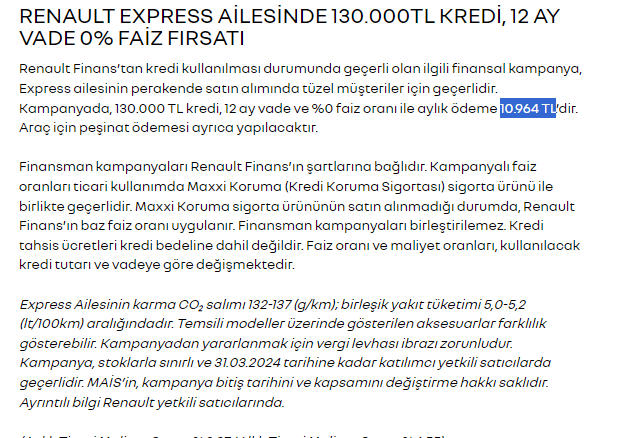 Bu finansman kampanyası, Renault Finans'ın kurallarına bağlı. Kampanyadaki faiz oranları, sadece ticari kullanımlar için ve Maxxi Koruma Sigortası'yla birlikte geçerli. Eğer Maxxi Koruma Sigortası alınmazsa, Renault Finans normal faiz oranlarını uygular. Bu kampanyalar birleştirilemez. Kredi masrafları, krediye dahil değil. Faiz ve maliyet oranları, ne kadar kredi alındığına ve vadeye göre değişir. Express ailesinin araçları 132-137 g/km CO₂ salar ve 100 km'de 5,0-5,2 litre yakıt tüketir. Gösterilen modeller ve aksesuarlar farklılık gösterebilir. Bu kampanyadan faydalanmak için vergi levhanızı göstermeniz gerekiyor. Kampanya, stoklarla ve 31 Mart 2024 tarihine kadar sınırlı.