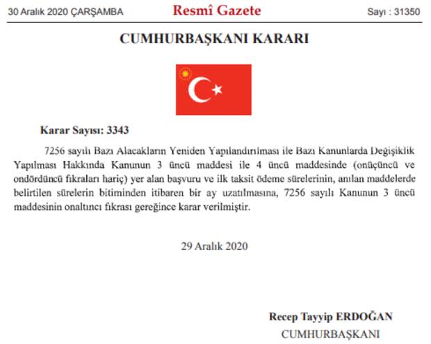 Buna göre, daha önce 31 Aralık 2020 olan başvuru süresi ve ilk taksit süresi bir ay uzatıldı.