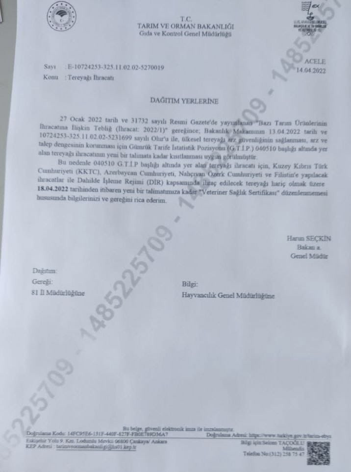 Kararın ülkesel tereyağı arz güvenliğinin sağlanması, arz ve talep dengesinin korunması için alındığı belirtildi.