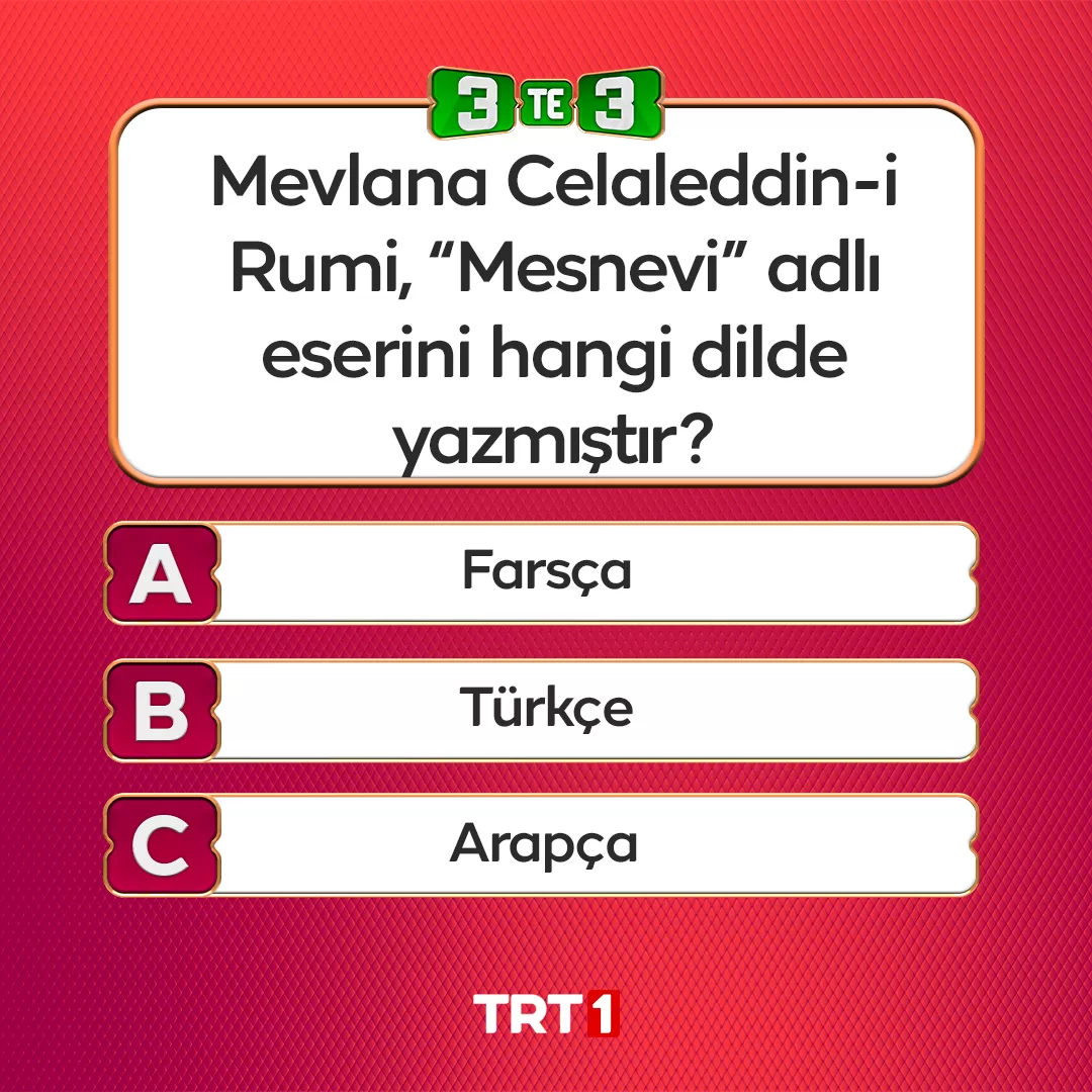 3'te 3 tarihte bu akşam sorulan soru geceye damga vurdu. Mevlana Celaleddin-i Rumi Mesnevi adlı eserini hangi dilde yazmıştır? sorusu cevap arıyor.