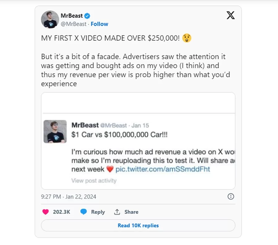 MrBeast, X'te yayınladığı bir gönderide, sosyal medya platformundaki ilk videosunun 156 milyon gösterim ve 5 milyondan fazla etkileşime ulaştığını açıkladı. Bu başarı, MrBeast'e şu ana kadar 263.655 dolarlık bir gelir sağladı. Ayrıca kazandığı geliri takipçileriyle paylaşma sözü veren MrBeast, "Bunu yeniden paylaşan ve beni takip eden rastgele 10 kişiye eğlence için 25.000 dolar vereceğim" dedi.