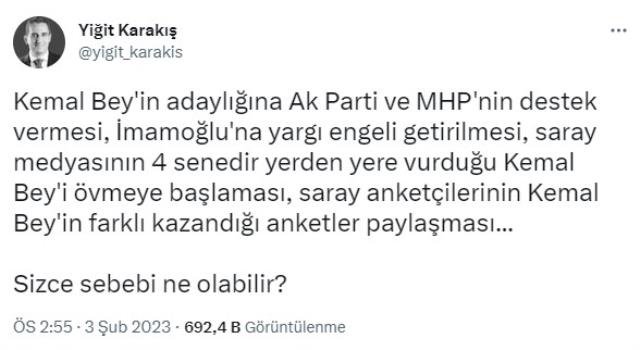 Karakış, bir diğer paylaşımında ise şunları söyledi: "Kemal Bey'in adaylığına Ak Parti ve MHP'nin destek vermesi, İmamoğlu'na yargı engeli getirilmesi, saray medyasının 4 senedir yerden yere vurduğu Kemal Bey'i övmeye başlaması, saray anketçilerinin Kemal Bey'in farklı kazandığı anketler paylaşması... Sizce sebebi ne olabilir?"