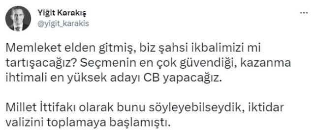 Karakış, "Memleket elden gitmiş, biz şahsi ikbalimizi mi tartışacağız? Seçmenin en çok güvendiği, kazanma ihtimali en yüksek adayı Cumhurbaşkanı yapacağız. Millet İttifakı olarak bunu söyleyebilseydik, iktidar valizini toplamaya başlamıştı." dedi.