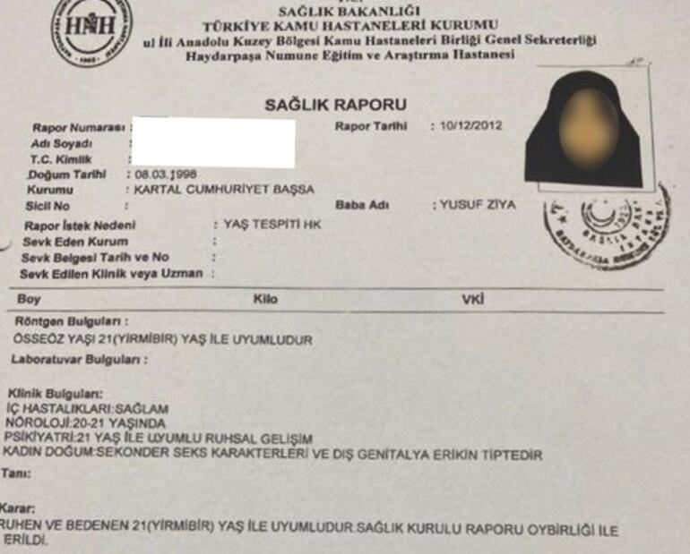 Dava dosyasına giren 2012 tarihli yaş tespiti raporu ortaya çıktı. Raporda H.K.G.'nin doğum tarihi 8 Mart 1998 olarak belirtiliyor. Rapor tarihinde 14 yaşında olduğu görülen H.K.G.'ye ruhen ve bedenen 21 yaş ile uyumlu olduğu değerlendirmesi yapılıyor. Oy birliğiyle verilen raporda, iç hastalıkları sağlam, nöroloji 21 yaşında, psikiyatri 21 yaş ile uyumlu ruhsal gelişim, kadın doğum sekonder seks karakterleri ve dış genitalya erikin tiptedir tespitleri yer aldığı görülüyor.