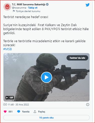 Milli Savunma Bakanlığı'nın sosyal medya hesabından yapılan açıklamada, “Terörist neredeyse hedef orası! Suriye'nin kuzeyindeki Fırat Kalkanı ve Zeytin Dalı bölgelerinde tespit edilen 8 PKK/YPG'li terörist etkisiz hale getirildi. Terörle ve teröristle mücadelemiz etkin ve kararlı şekilde sürecek” ifadeleri kullanıldı.
