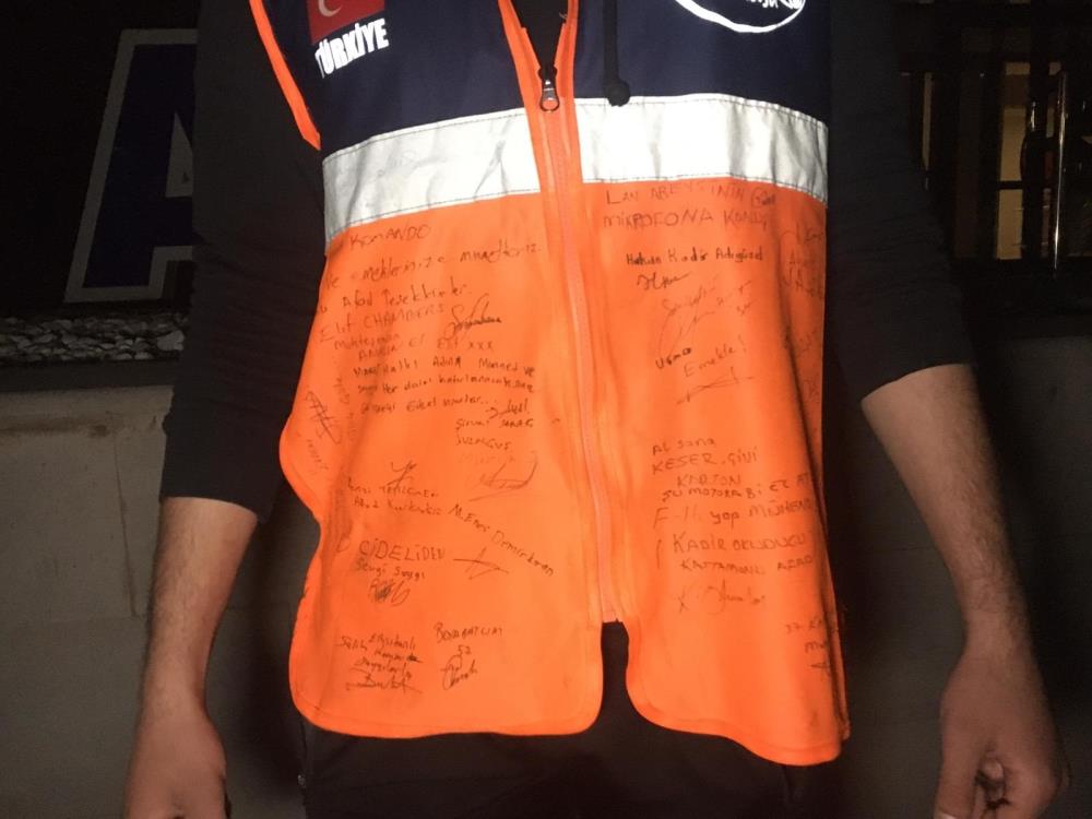 AFAD gönüllüsü Halil Erdem Madenli ise, "Gerçekleştirmiş olduğumuz bu sorumluluk projesinde onlardan hatıra istedik. Oradaki insanlardan iyi dileklerini birkaç kelimeyle ifade edilmesini istedim. Onlardan hatıra olarak imzasını aldım. Depremzeden oradaki ekibe kadar bütün insanlardan hatıralar biriktirdik. Bu yeleği Kastamonu gönüllülük ofisine teslim edeceğim" şeklinde konuştu.