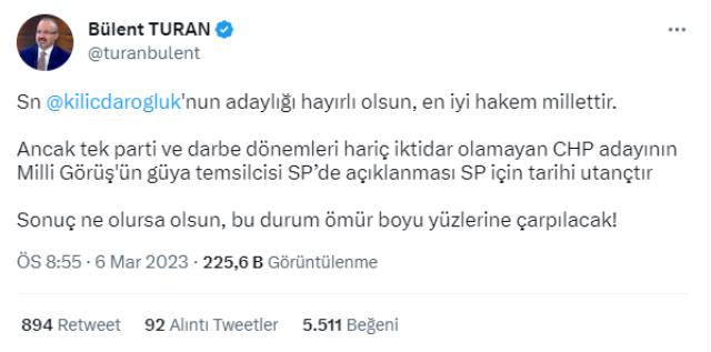 Turan sözlerine şöyle devam etti: "Ancak tek parti ve darbe dönemleri hariç iktidar olamayan CHP adayının Milli Görüş'ün güya temsilcisi SP'de açıklanması SP için tarihi utançtır. Sonuç ne olursa olsun, bu durum ömür boyu yüzlerine çarpılacak!"