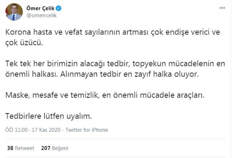 AK Parti Sözcüsü Çelik, Twitter'daki hesabından yaptığı açıklamada, "Korona hasta ve vefat sayılarının artması çok endişe verici ve çok üzücü. Tek tek her birimizin alacağı tedbir, topyekun mücadelenin en önemli halkası. Alınmayan tedbir en zayıf halka oluyor. Maske, mesafe ve temizlik, en önemli mücadele araçları. Tedbirlere lütfen uyalım" dedi.