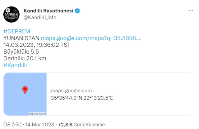 Kandilli Rasathanesi, Akdeniz açıklarındaki depremin merkez üssünü Yunanistan olarak duyurdu. Kandilli, 20.1 kilometre derinlikte gerçekleşen depremin büyüklüğünün 5.5 olduğunu belirtti.