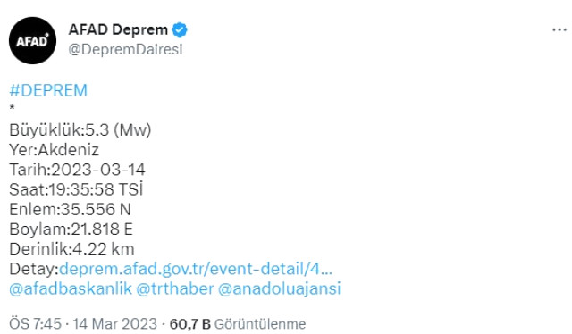 Kahramanmaraş'ta bugün yaşanan peş peşe depremlerin ardından bir haber de Akdeniz'den geldi. Akdeniz açıklarında 5.3 büyüklüğünde deprem yaşandı.