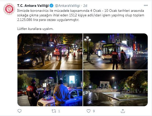 Valiliğin Twitter hesabından yapılan açıklamada, "İlimizde koronavirüs ile mücadele kapsamında 4-10 Ocak tarihleri arasında sokağa çıkma yasağını ihlal eden bin 512 kişiye adli/idari işlem yapılmış olup, toplam 2 milyon 125 bin 86 lira para cezası uygulanmıştır. Lütfen kurallara uyalım" denildi.