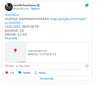 Kandilli Rasathanesi'nden edinilen bilgilere göre, Kahramanmaraş'ın Nurhak ilçesinde 3.8 büyüklüğünde deprem meydana geldi.