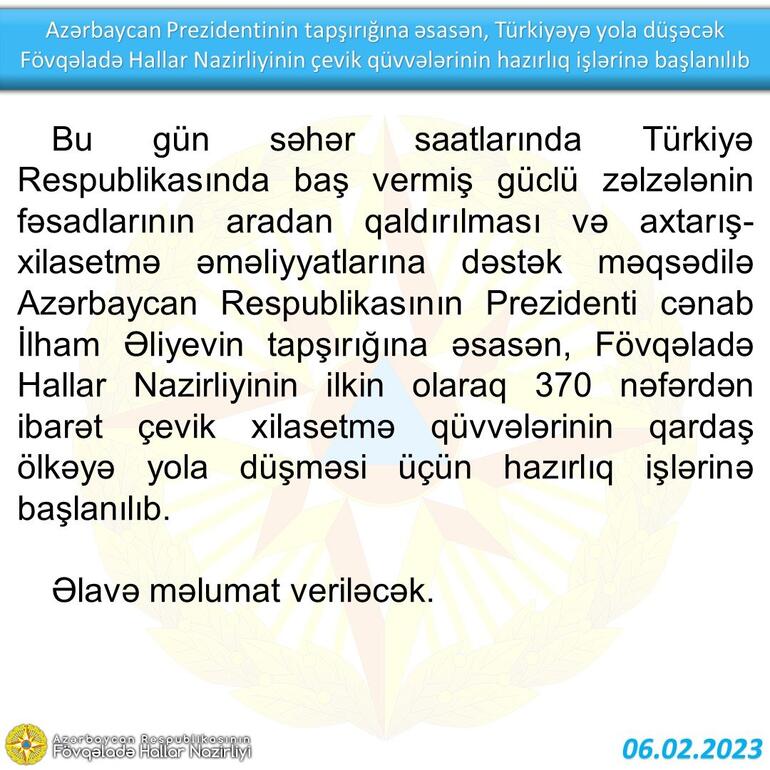 Azerbaycan Olağanüstü Haller Bakanlığı yaptığı açıklamada “Azerbaycan Cumhuriyeti Cumhurbaşkanı İlham Aliyev'in talimatıyla, Türkiye Cumhuriyeti'nde meydana gelen şiddetli depremin etkilerinin ortadan kaldırılması ve arama kurtarma çalışmalarına destek amacıyla hazırlık çalışmaları başlatıldı. Acil Durumlar Bakanlığı'nın başlangıçta 370 kişiden oluşan esnek kurtarma güçlerinin kardeş ülkeye hareket edecek” denildi.