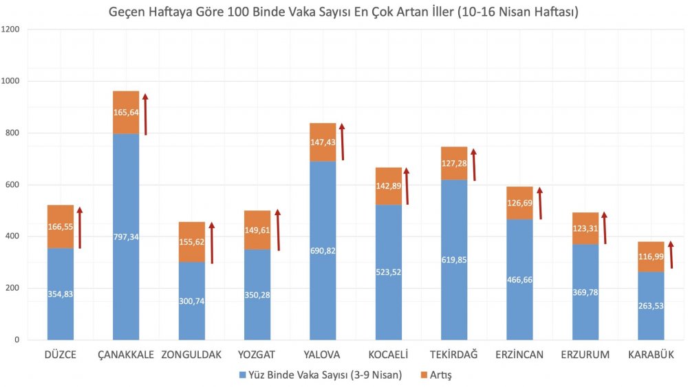 Sağlık Bakanı Fahrettin Koca, sosyal paylaşım sitesi Twitter üzerinden yaptığı paylaşımda, "100.000 nüfusa karşılık gelen haftalık vaka sayısı en çok artan illerimiz Düzce, Çanakkale, Zonguldak, Yozgat ve Yalova. Azalan illerimiz ise Kırklareli, Kilis, Samsun, Osmaniye ve Adıyaman. Vaka sayısı artış hızı azaldı. Vaka sayıları da tedbirlerle birlikte azalacak" ifadelerini kullandı.