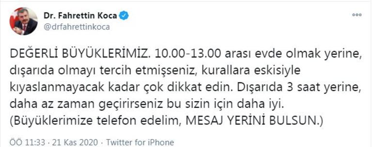 Bakan Koca, Twitter hesabından yaptığı açıklamada, "Değerli büyüklerimiz; 10.00-13.00 arası evde olmak yerine, dışarıda olmayı tercih etmişseniz, kurallara eskisiyle kıyaslanmayacak kadar çok dikkat edin. Dışarıda 3 saat yerine, daha az zaman geçirirseniz bu sizin için daha iyi" ifadelerini kullandı.