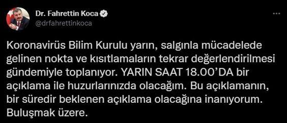 Bakan Koca açıklamasında, "Koronavirüs Bilim Kurulu yarın, salgınla mücadelede gelinen nokta ve kısıtlamaların tekrar değerlendirilmesi gündemiyle toplanıyor. Yarın saat 18.00'da bir açıklama ile huzurlarınızda olacağım. Bu açıklamanın, bir süredir beklenen açıklama olacağına inanıyorum. Buluşmak üzere." dedi.