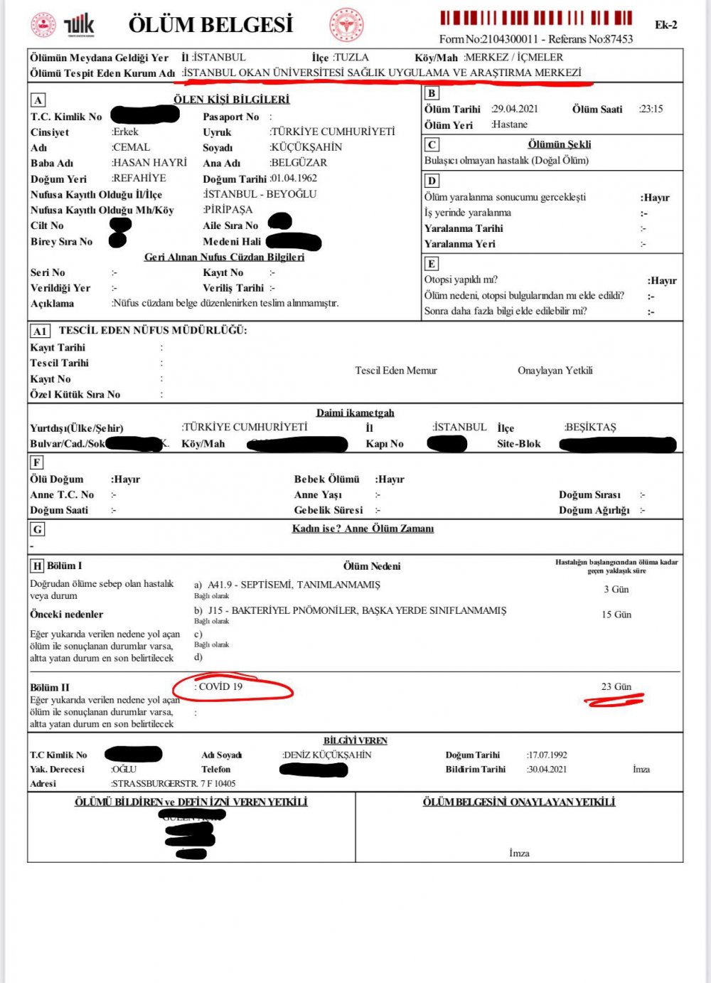 "Özetle bir vakıf üniversitesi hastanesinde tedavi görürken ölüm raporunda tüm bilgilerin eksiksiz verilmediği bir vatandaşımızın devletimizin kayıtlarında durumu olması gerektiği gibi covid-19 olarak yer almıştır. Buradan bilgilerin güvenilirliğini şüpheli hale getirmenin kimseye faydası yoktur. Müteveffa Cemal Küçükşahin Bey'e Allah'tan rahmet ve sevenlerine bu vesile ile tekrar başsağlığı diliyorum."