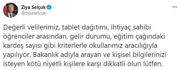 Değerli velilerimiz, tablet dağıtımı, ihtiyaç sahibi öğrenciler arasından, gelir durumu, eğitim çağındaki kardeş sayısı gibi kriterlerle okullarımız aracılığıyla yapılıyor. Bakanlık adıyla arayan ve kişisel bilgilerinizi isteyen kötü niyetli kişilere karşı dikkatli olun lütfen.