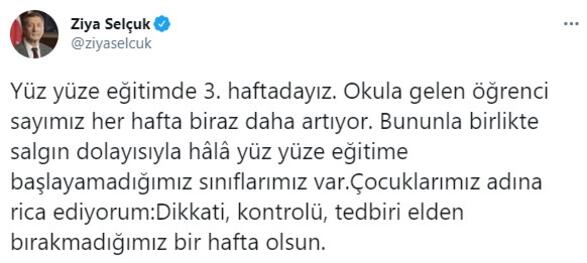 Yüz yüze eğitimde 3. haftadayız. Okula gelen öğrenci sayımız her hafta biraz daha artıyor. Bununla birlikte salgın dolayısıyla hâlâ yüz yüze eğitime başlayamadığımız sınıflarımız var. Çocuklarımız adına rica ediyorum: Dikkati, kontrolü, tedbiri elden bırakmadığımız bir hafta olsun.