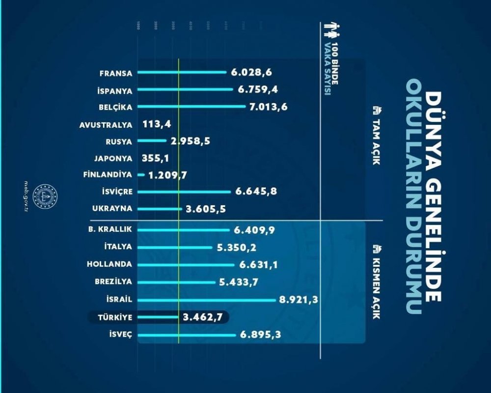 Milli Eğitim Bakanı Ziya Selçuk, dünya genelinde okullarda eğitimin nasıl devam ettiğine yönelik bir tablo yayınladı. Bakan Selçuk, konu hakkında sosyal medya hesabından yaptığı paylaşımda, "Salgını tüm dünyayla birlikte yaşıyoruz ve dünya çocukları eğitimde benzer süreçlerden geçiyor. Dünyayı yakından takip ediyoruz. Bizim hedefimiz de 'Okullar tamamen açık ve çocuklarımız güvenle eğitime devam ediyor' diyebilmek. Başarabilmek elimizde, sorumluluk hepimizde" ifadelerini kullandı.