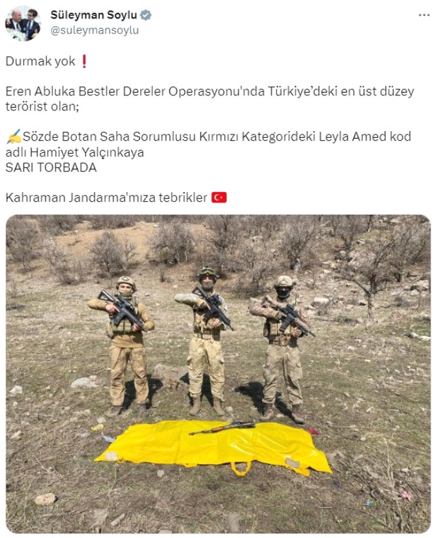 Soylu'nun açıklamasında şu ifadeler yer aldı: "Durmak yok! Eren Abluka Bestler Dereler Operasyonu'nda Türkiye'deki en üst düzey terörist olan; Sözde Botan Saha Sorumlusu Kırmızı Kategorideki Leyla Amed kod adlı Hamiyet Yalçınkaya sarı torbada! Kahraman Jandarma'mıza tebrikler"