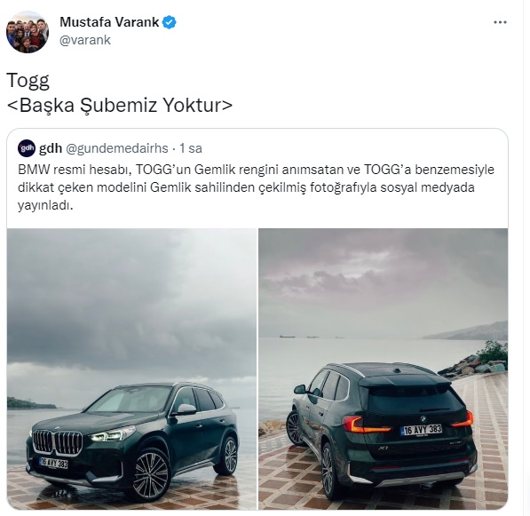 BMV resmi hesabı yerli otomobil TOGG'un Gemlik rengini anımsatan modelini Gemlik sahilinden çekilmiş fotoğrafıyla sosyal medyada yayınladı. Bunun üzerine Bakan Varank, espriyle karışık BMW'ye göndermede bulundu.