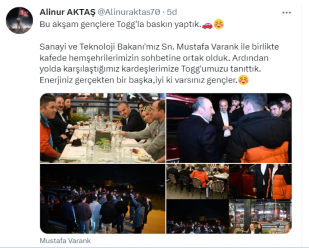 Aktaş'ın paylaşımı şöyle; "Bu akşam gençlere Togg'la baskın yaptık. Sanayi ve Teknoloji Bakanı'mız Sn. Mustafa Varank ile birlikte kafede hemşehrilerimizin sohbetine ortak olduk. Ardından yolda karşılaştığımız kardeşlerimize Togg'umuzu tanıttık. Enerjiniz gerçekten bir başka,iyi ki varsınız gençler."