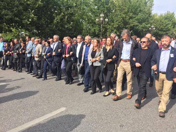 HDP'li Eş Başkan Selahattin Demirtaş'ın dışında, vekiller Ertuğrul Kürkçü, Sırrı Süreya Önder gibi isimlerle kolkola, alana girenler arasında CHP Genel Başkan Yardımcısı Sezgin Tanrıkulu ile Ankara Milletvekili Aylin Nazlıaka yer aldı.