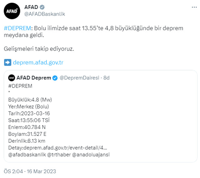 AFAD verilerine göre merkez üssü Bolu olan, 4,8 büyüklüğünde deprem meydana geldi. Vatandaşlar sarsıntı ile sokağa döküldü. Ekipler incelemelerini sürdürüyor.
