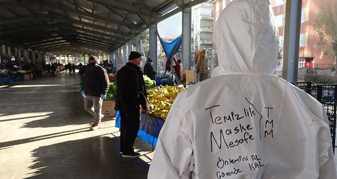 Türkiye genelinde hafta sonu sokağa çıkma yasağı uygulaması öncesinde vatandaşlar market ve pazar yerlerinde yoğunluk oluşturdu. Tokat'ta da pazar yerinde polis ve zabıt ekipleri önlemlerini artırdı. Pazar yerine tulum giyerek giren Mustafa Işık (30) ilginç görüntüler oluşturdu. Maskesinin yanı sıra siperlik ve eldiven alışveriş yapan Işık, tulumun arkasına “Maske, mesafe ve hijyen, önlem al güvende kal” yazarak dikkat çekmeye çalıştı. Artan korona virüs vakaları nedeni ile önlem aldığını belirten Işık, “Genelde pazar alışverişi yaparken bu kıyafeti giyiyorum. Kalabalık ortamlarda virüs bulaşma riski yüksek olduğu için kendimi korumak için bu şekilde giyindim” dedi.