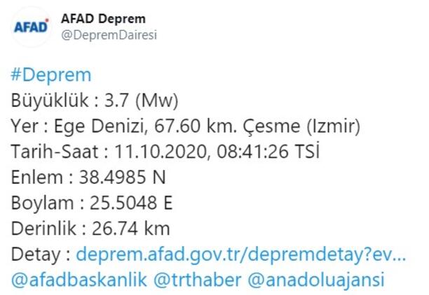 AFAD'dan yapılan açıklamada, Ege Denizi'de saat 08.41'de deprem meydana geldi. Çeşme açıklarında meydana gelen depremin büyüklüğünün 3.7 olarak açıklandı. Depremin derinliğinin ise 26.74 km olarak duyuruldu.
