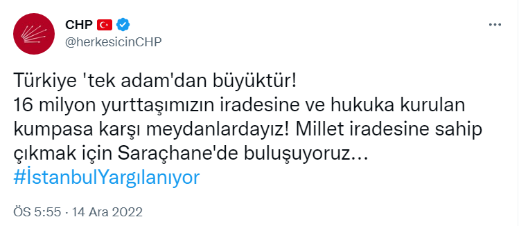 Millet iradesine sahip çıkmak için Saraçhane'de buluşuyoruz. #istanbulyargılanıyor.”