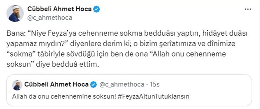 Cübbeli Ahmet Hoca, sosyal medya hesabından yaptığı paylaşımda, "Feyza Altun tutuklansın" etiketiyle birlikte, "Allah da onu cehennemine soksun" ifadelerini kullandı. Bu sert sözleriyle dikkat çeken Cübbeli Ahmet Hoca, Feyza Altun'un şeriat karşıtı bir paylaşım yapmasına tepki gösterdi.