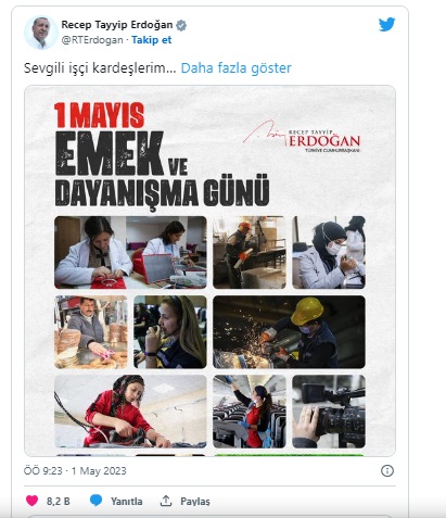 "Sevgili işçi kardeşlerim, geçimini kaptanlık yaparak sağlayan emektar bir babanın evladıyım. Gençlik yıllarında İETT’de işçi olarak çalışmış, ter dökmüş bir kardeşinizim. Emeğin, alın terinin, arkadaşlarla bir sıcak somunu paylaşmanın mutluluğunu çok iyi bilirim. Ülkemize siyaset yoluyla hizmet etme mücadelemizde bu köklerimizi ve nereden geldiğimizi asla unutmadık. Daima sizlerin hakkını teslim etmeye çalıştık. Yıllarca istismar malzemesi yapılan 1 Mayıs’ı sizler için tatil ilan ettik, gerçek anlamda işçi bayramı yaptık. Örgütlenme, sendikal haklar, ücretlerle beraber işçi sağlığı ve güvenliğinde çok önemli adımlar attık. 2002'de 184 lira olan, yani 126 dolara tekabül eden asgari ücreti bugün 8 bin 500 liraya, yani 437 dolara yükselttik. Asgari ücreti ve diğer ücretlilerin asgari ücret kadarki gelirlerini vergi dışı bıraktık. Ne yaptıysak beraber yaptık, beraber başardık, sırt sırta vererek zorlukların üstesinden beraberce geldik. İnşallah Türkiye Yüzyılı'nı da yine sizlerle beraber inşa edeceğiz. 14 Mayıs’ta siz işçi kardeşlerimin desteğine güveniyorum. 1 Mayıs Emek ve Dayanışma Günü'nüzü canıgönülden tebrik ediyorum."