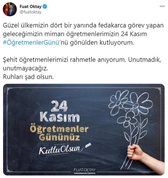 Oktay, sosyal medya hesabından paylaştığı mesajında, "Güzel ülkemizin dört bir yanında fedakarca görev yapan geleceğimizin mimarı öğretmenlerimizin 24 Kasım Öğretmenler Günü'nü gönülden kutluyorum. Şehit öğretmenlerimizi rahmetle anıyorum. Unutmadık, unutmayacağız. Ruhları şad olsun." ifadelerini kullandı.